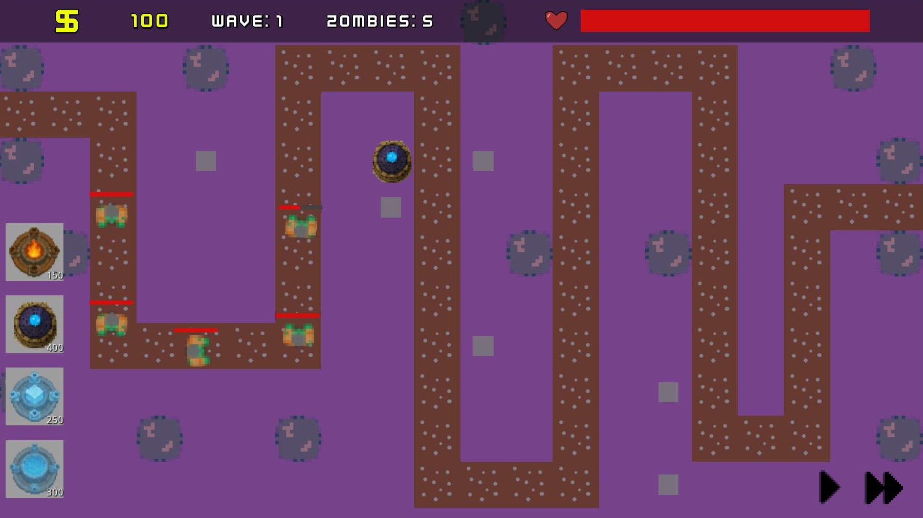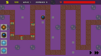 You can put down the towers to kill the zombies on every wave. There are 3 waves. Every time you kill a zombie, you get 50$. You need to collect the money to build more towers. You can upgrade the towers by 10% for 100$. Every zombie deals 20 damage, and you have 100 health. If 5 zombies pass the path, you have to play the game again. You can speed up the game and press the button to pause/play at any point in the game.